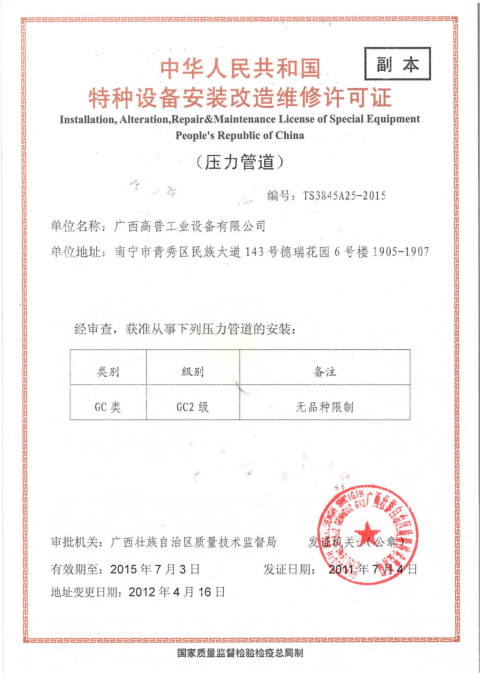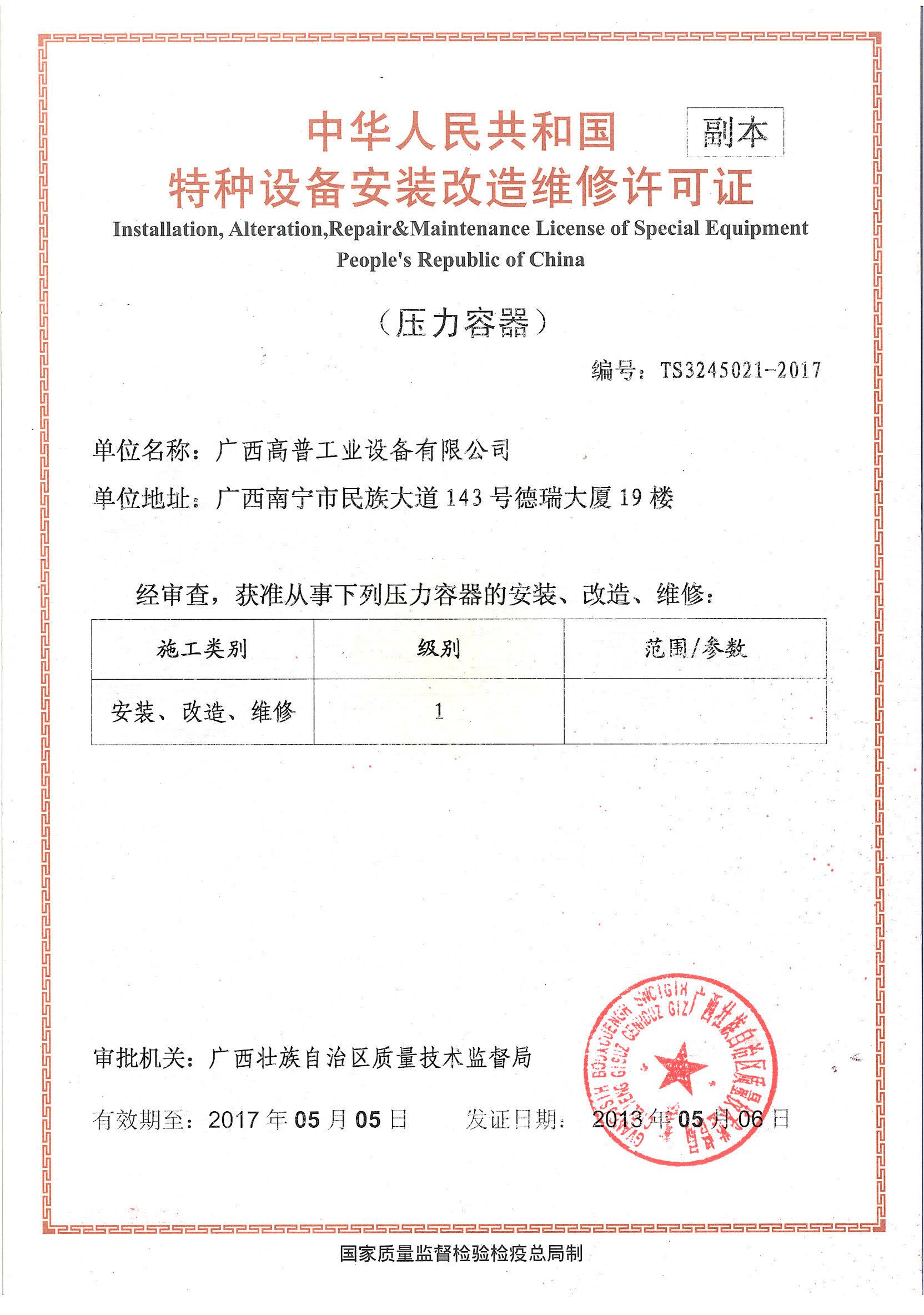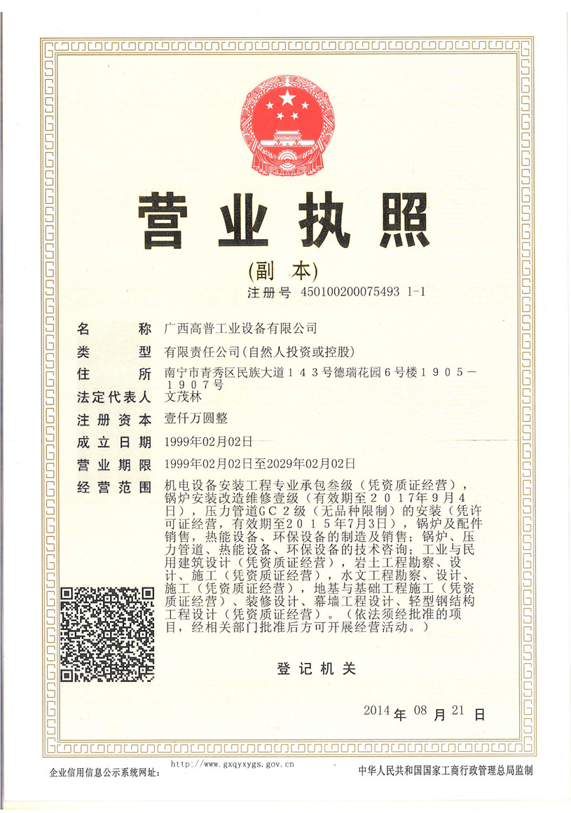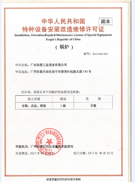 廣西高普工業(yè)設(shè)備有限公司的前身是南寧高普熱能設(shè)備有限公司,是一家成立于1998年,具有獨(dú)立企業(yè)法人資格的的有限責(zé)任公司。公司總部設(shè)在廣西首府南寧。在云南、宜賓等多處地方、地區(qū)設(shè)有辦事及分公司。 本公司是高新技術(shù)企業(yè),持有國家技術(shù)監(jiān)督局頒發(fā)的1級(jí)《特種設(shè)備安裝、改造、維修(鍋爐)》許可證,1級(jí)許可證是最高級(jí)別,可安裝、改造、維修任何形式、參數(shù)的鍋爐設(shè)備。并持有《壓力管道》安裝、改造維修許可證,1級(jí)《壓力容器》安裝、改造、維修,機(jī)電設(shè)備安裝工程專業(yè)承包3級(jí)等資質(zhì)。 公司擁有雄厚的人力資源和技術(shù)裝備力量。在現(xiàn)有正式員工中,鍋爐及相關(guān)專業(yè)工程技術(shù)人員55名,其中高級(jí)工程師10名,工程師32名。持證焊工55名,持有合格項(xiàng)目七十多項(xiàng)次,項(xiàng)目中包含了一類鋼種和二類鋼種的各種形式的電弧焊及氬弧焊。無損檢測(cè)人員11人,Ⅲ級(jí)2人,II級(jí)9人,項(xiàng)目包括含常規(guī)四種探傷方法。機(jī)電設(shè)備安裝專業(yè)工程人員58人,撻有相關(guān)專業(yè)證書涵蓋40多項(xiàng)專業(yè)項(xiàng)目。其中:宜賓分司駐有員工108人,其中工程技術(shù)人員23人,高級(jí)工程師3人,工程師7人,助理工程師13人,持證焊工20人,II級(jí)無損檢測(cè)人員5人。 本公司多年專業(yè)從事鍋爐設(shè)備的安裝、改造、維修工作,擁有多名業(yè)內(nèi)知名的鍋爐專家,有技術(shù)過硬的施工隊(duì)伍,在制糖行業(yè)、造紙、發(fā)電行業(yè)等領(lǐng)域,有良好的聲譽(yù)。..詳細(xì)